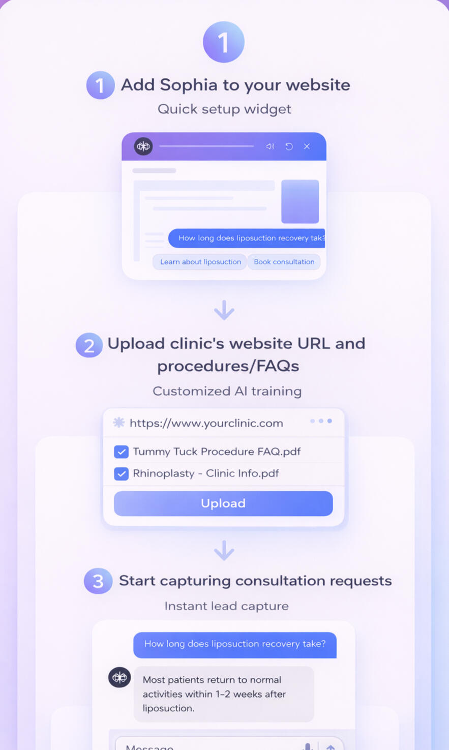 Many plastic surgery consultations start with simple questions about procedures, recovery, and pricing. Sophia answers patient questions instantly and guides them toward scheduling consultations with your clinic.Available 24/7 on your website, Sophia helps capture more consultation requests while reducing the workload on your front desk.