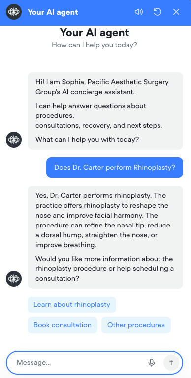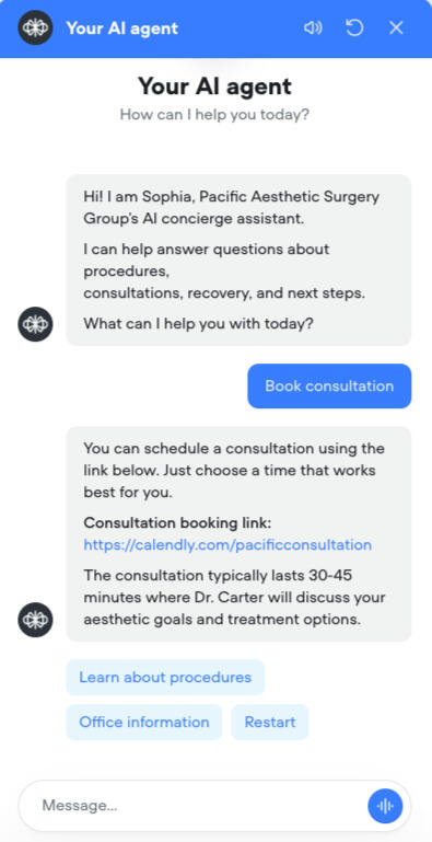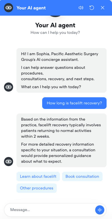 Many plastic surgery consultations start with simple questions about procedures, recovery, and pricing. Sophia answers patient questions instantly and guides them toward scheduling consultations with your clinic.Available 24/7 on your website, Sophia helps capture more consultation requests while reducing the workload on your front desk.