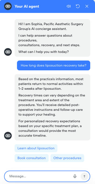Clinics and businesses across many industries are adopting AI chatbots to answer questions faster, improve response times, and capture more inquiries.For plastic surgery clinics, AI chat assistants can handle common questions about procedures, recovery timelines, and consultations — helping patients get answers instantly while freeing up your front desk.